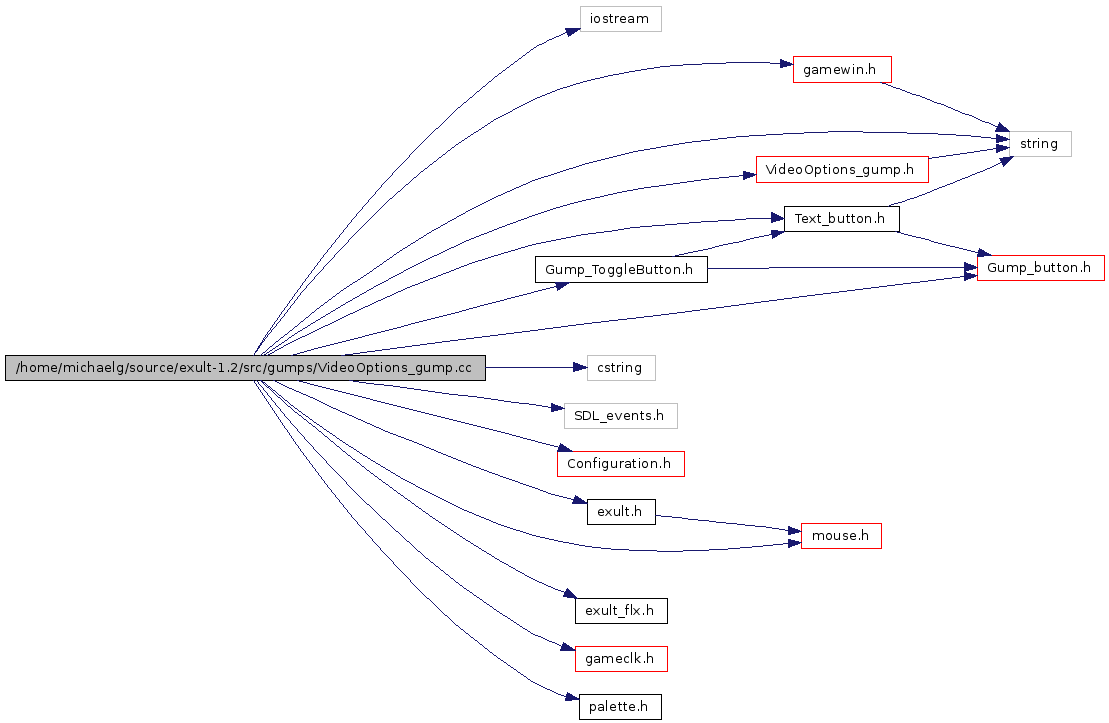 #include <iostream>#include <string>#include <cstring>#include "SDL_events.h"#include "Configuration.h"#include "Gump_button.h"#include "Gump_ToggleButton.h"#include "VideoOptions_gump.h"#include "exult.h"#include "exult_flx.h"#include "gamewin.h"#include "gameclk.h"#include "mouse.h"#include "Text_button.h"#include "palette.h"Include dependency graph for VideoOptions_gump.cc: