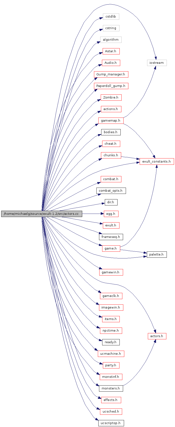 #include <iostream>#include <cstdlib>#include <cstring>#include <algorithm>#include "Astar.h"#include "Audio.h"#include "Gump_manager.h"#include "Paperdoll_gump.h"#include "Zombie.h"#include "actions.h"#include "actors.h"#include "bodies.h"#include "cheat.h"#include "chunks.h"#include "combat.h"#include "combat_opts.h"#include "dir.h"#include "egg.h"#include "exult.h"#include "frameseq.h"#include "game.h"#include "gamewin.h"#include "gamemap.h"#include "gameclk.h"#include "imagewin.h"#include "items.h"#include "npctime.h"#include "ready.h"#include "ucmachine.h"#include "party.h"#include "monstinf.h"#include "exult_constants.h"#include "monsters.h"#include "effects.h"#include "palette.h"#include "ucsched.h"#include "ucscriptop.h"Include dependency graph for actors.cc: