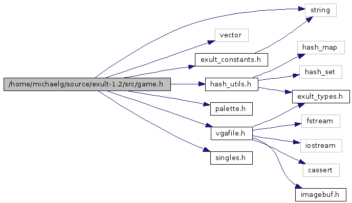 #include <string>#include <vector>#include "hash_utils.h"#include "exult_constants.h"#include "palette.h"#include "vgafile.h"#include "singles.h"Include dependency graph for game.h: