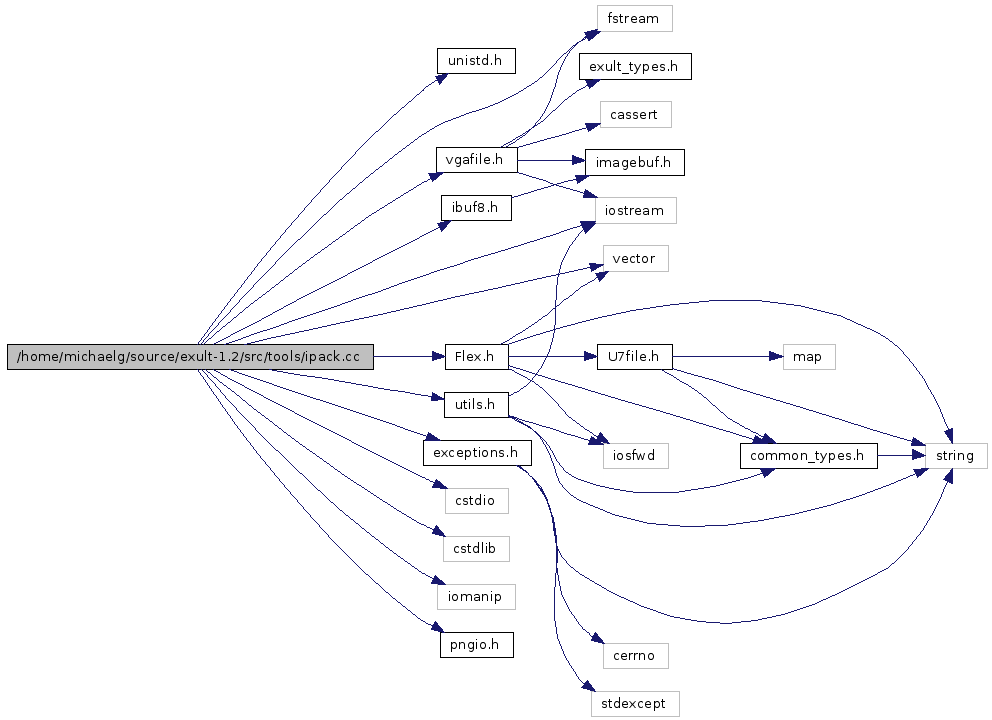 #include <unistd.h>#include <fstream>#include <cstdio>#include <cstdlib>#include <iostream>#include <iomanip>#include <vector>#include "Flex.h"#include "utils.h"#include "exceptions.h"#include "vgafile.h"#include "pngio.h"#include "ibuf8.h"Include dependency graph for ipack.cc: