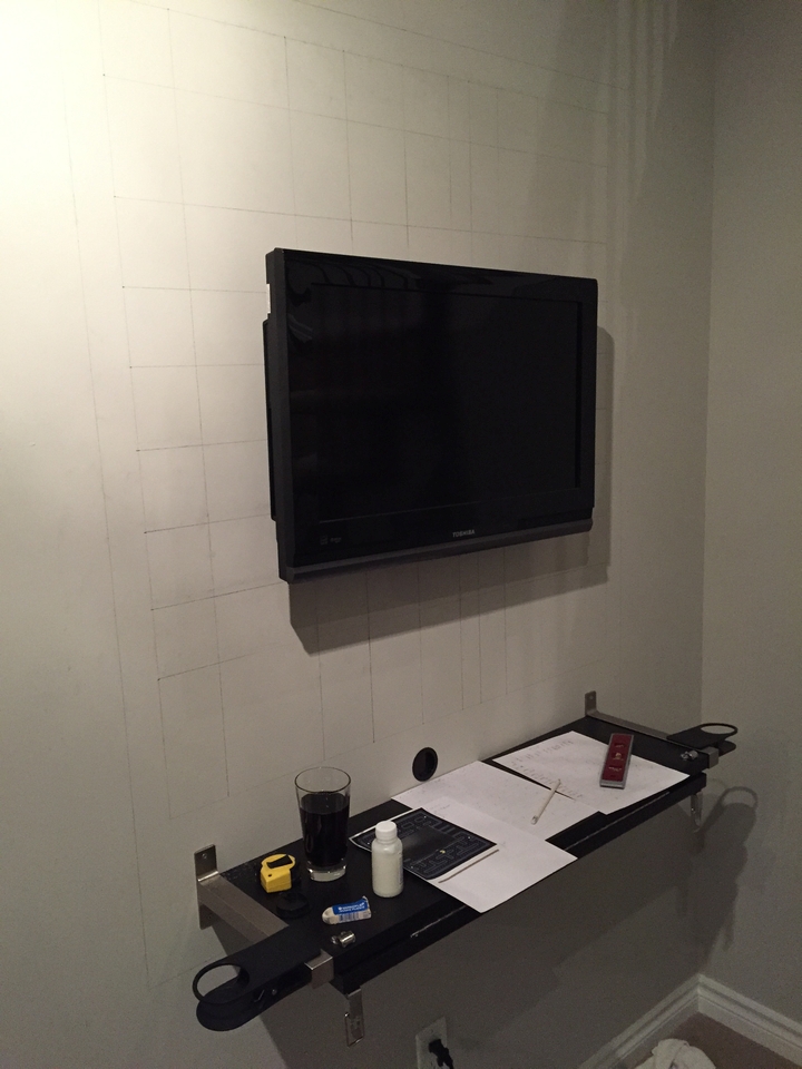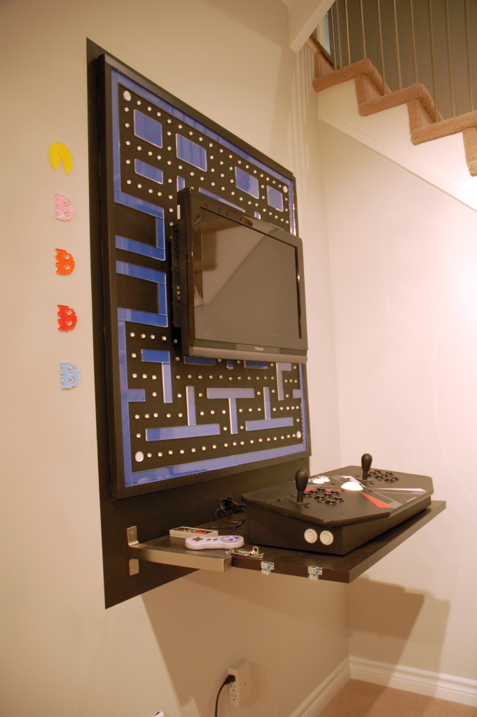 The panel was mounted flush with the wall using four metal clasps screwed into each corner. I wanted the arcade to have more of a built-in feel, encompassing the joystick shelf and the panel, so I painted a region around the arcade giving it more of a framed in look.