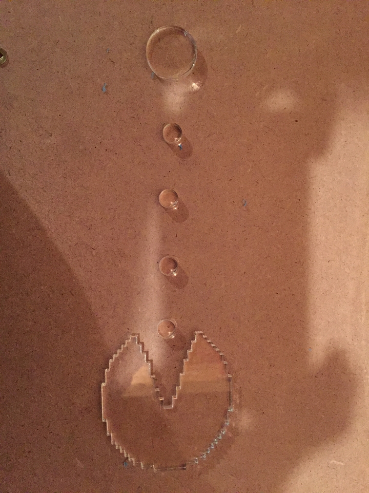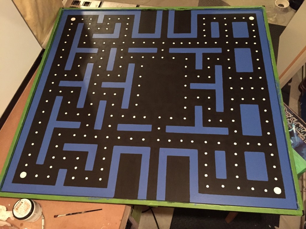 The gluing process was almost as tedious as the painting process since the glue could not be applied on top of the painted area as it would have been visible if it sat between the painted surface and the clear acrylic. It also wouldn’t have dried because the type of glue I used, Weldbond, requires exposure to air for curing. Instead, I applied the glue to the edges of the game board pieces (except for the pellets) using a needle. Ouch. The recommended approach above would have also made gluing the pieces to the board a lot easier as I could have used any kind of glue, rather than searching high and low for a specific kind of glue that was both strong and dried clear.