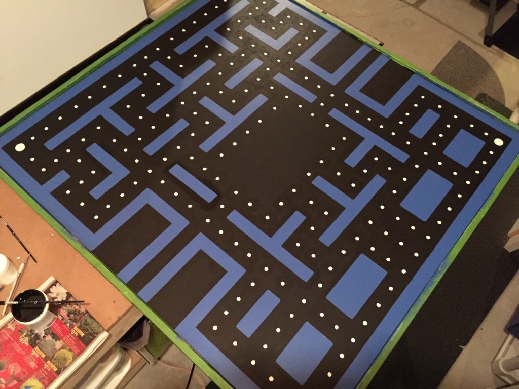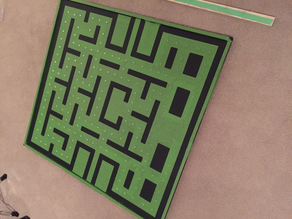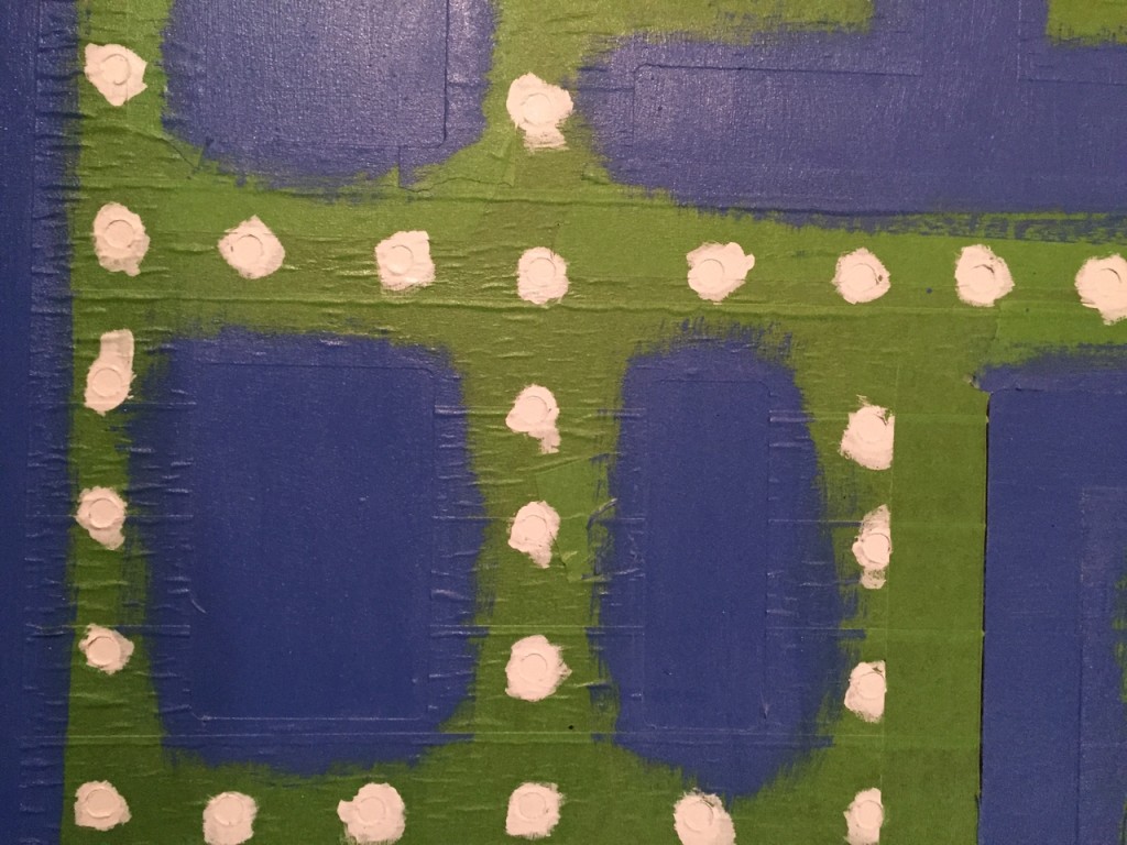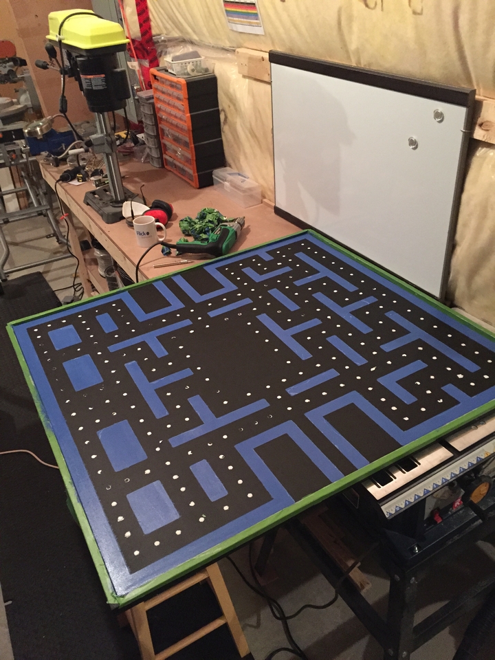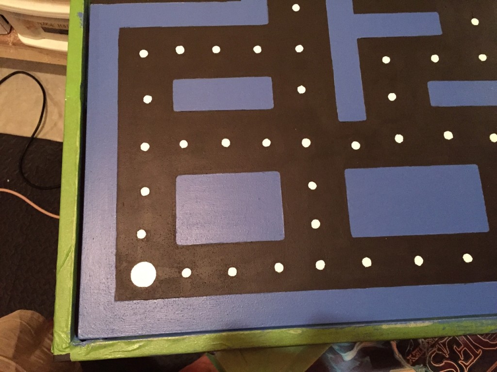 In order to transfer the Pac-Man like game board pattern to the painted base, I chose to tape the entire surface using painter’s tape. Following that, the acrylic pieces need to be laid out and traced, including all of the pellets from the pattern. Once traced, I cut them out with an X-Acto knife, and then created a special, circular drill bit to cut out the pellets. I chose to use those threaded wire funnels that come with light fixtures, but I needed to grind the bit for the edges to become sharp. Once the tape for the board pieces was cut out and removed, this exposed the flat black surface for paint.