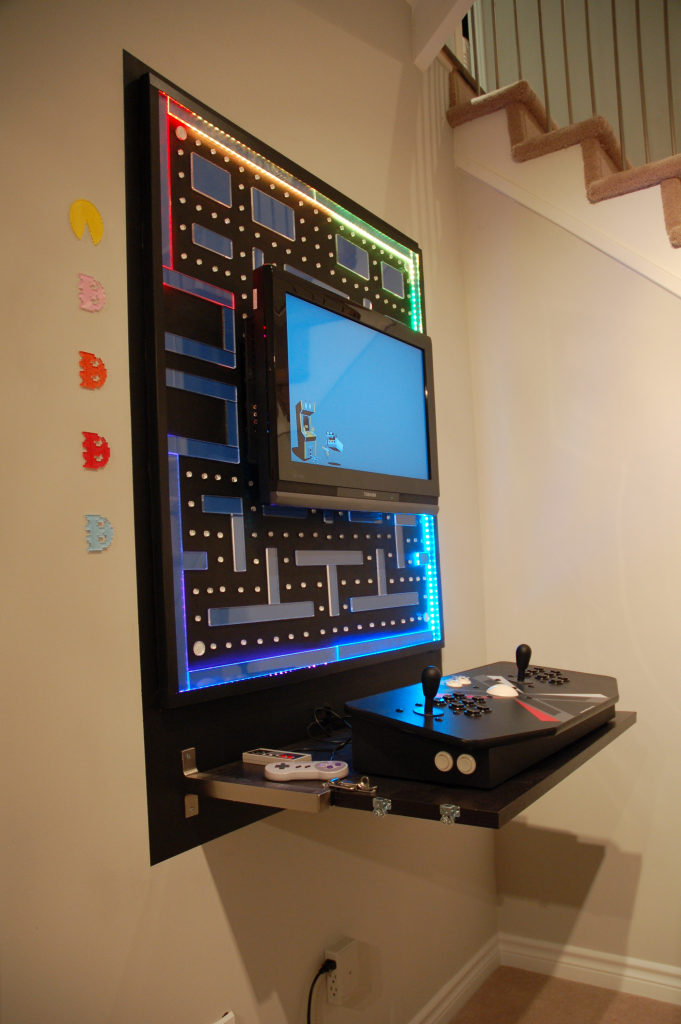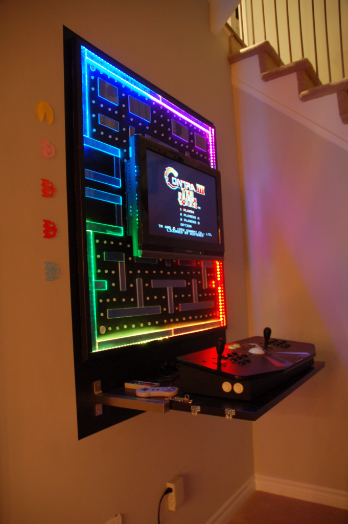 It consists of a themed wall panel, mounted flat screen high-definition television, an extended shelf, an X-Arcade Tank Stick, 257 individually addressable RGB LEDs on the inside edge of the panel, cup holders and a few decorations. The software driving the arcade is custom and consists of the primary server that controls the execution of the games, a mobile client application for selecting the games to play, and another server driving the decorative elements.