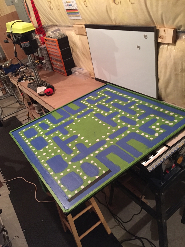 I included a few characters in the design such as Pac-man and the ghosts: Inky, Blinky, Pinky and Clyde. The were cut from acrylic and then painted on their opposite sides using some colourful latex paints. The Home Depot sells small “tester” paint samples which are far too small for a wall, but perfect for small projects like this one. I painted the undersides of the characters (by this point I had caught on to the better approach) and mounted them on the wall next to the arcade using some crazy glue in gel form.